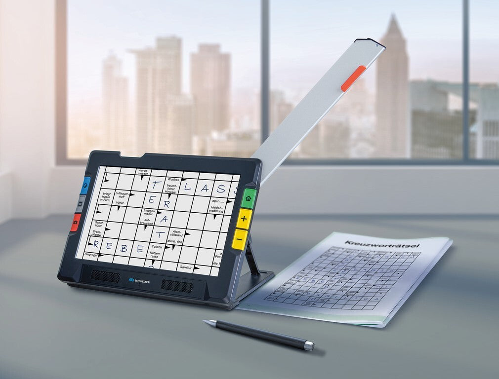 mit der sich z.B. eine DIN A4-Seite vollständig darstellen und gleichzeitig beschreiben lässt. Die große und dennoch sehr handliche elektronische Lupe überzeugt mit einer 25,8 cm Bildschirmdiagonale und ist somit ideal für den Einsatz zuhause und für unterwegs geeignet. Die Bedienung kann sowohl über große, fühlbare Direkttasten als auch über den Touchscreen bequem erfolgen. Dank zahlreicher innovativer und patentierter Technologien wird das Lesen wieder einfach