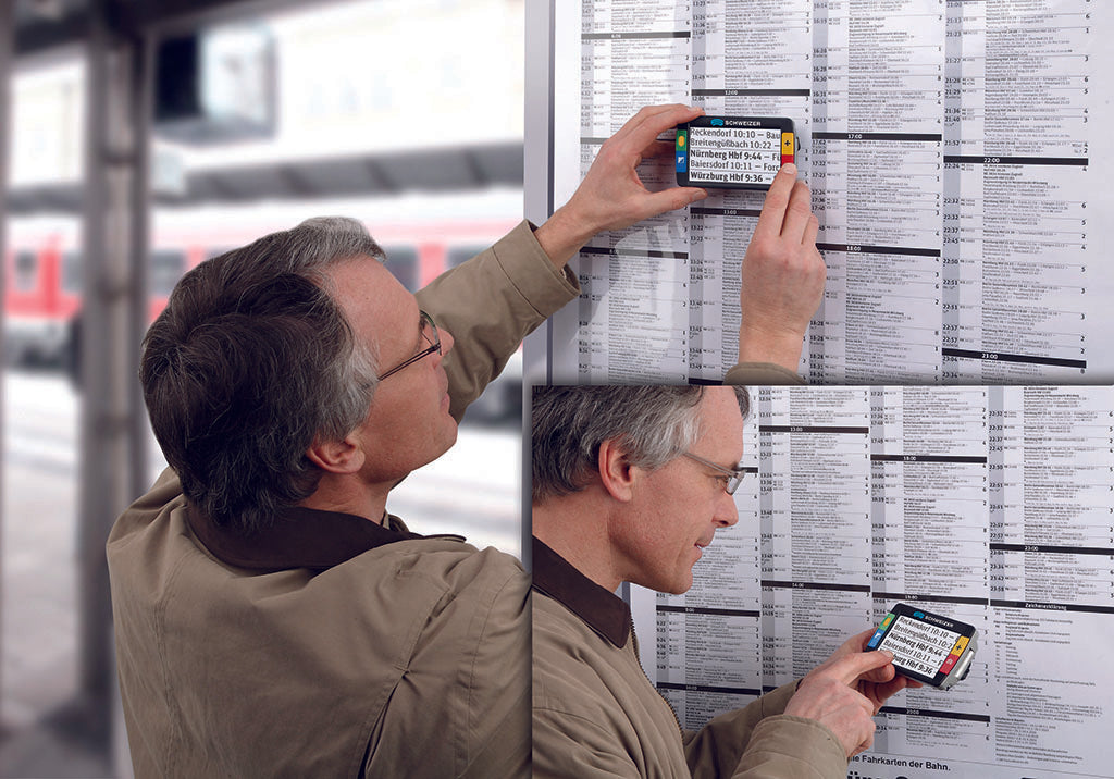 Die mittig platzierte Kamera erleichtert die Orientierung beim Lesen. Der ausklappbare Griff ermöglicht eine bequeme Nutzung: entweder in der Hand oder als Abstandshalter direkt auf dem Text.