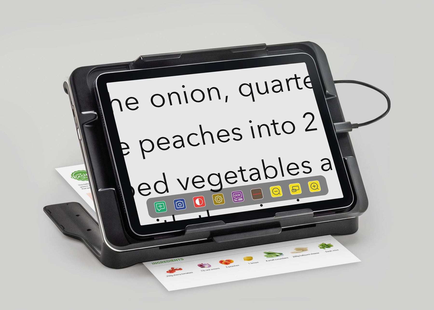 optaro® XL erweitert das iPad* in eine elektronische Sehhilfe und ein mobiles Bildschirmlesegerät - perfekt für unterschiedliche Sehaufgaben zuhause und für die Arbeit. Menschen mit beeinträchtigtem Sehvermögen erhalten mit optaro® XL die smarte Lösung für komfortables Lesen, Schreiben und Handarbeiten. Speziell auf das Lesen längerer Texte abgestimmt, nutzt optaro® XL das große Display des iPads und ergänzt das Tablet um zahlreiche Funktionen und Features.